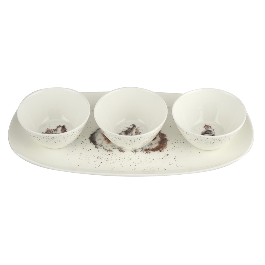 This fabulous ceramic 3 dish and tray set featuring gorgeous guinea pig designs is perfect for serving dips or snacks while entertaining. The tray measures 30 x 15cm and each dish measures 9cm.